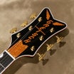 ジュエルドG-Arrowノブ、マルチプライのパーフリング付きゴールドスパークルバインディング、パーロイドNeo-Classic™サムネイルインレイ、蓄光式Luminlay®サイドドット、ゴースト処理されたGretschロゴとFalconグラフィックをあしらった厚みのあるゴールドヴィンテージプレキシピックガード、Bigsby® B6GPストリングスルーヴィブラート、ピン留め式エボニーべース付きSpace Control™ブリッジ、ボーンナット、Grover® Imperial™チューナーなどの特徴を備えています。