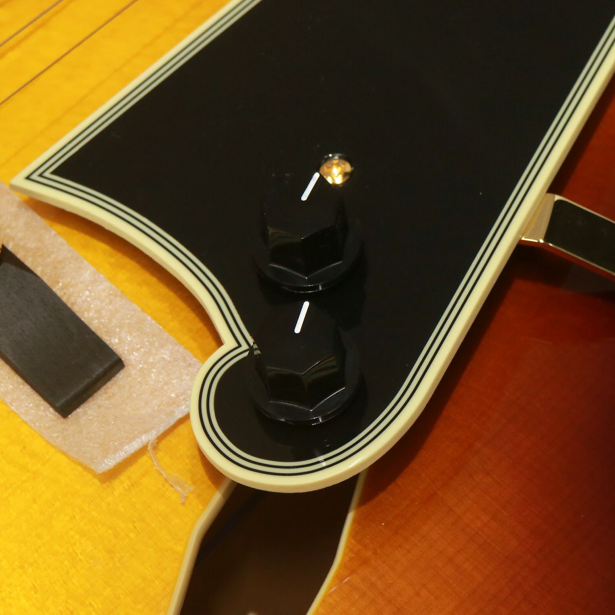 ディアンジェリコらしさを感じるオリジナル形状のピックガードは、fホールの一部を思わせるデザインで、ブラックとなっています。