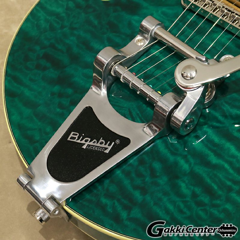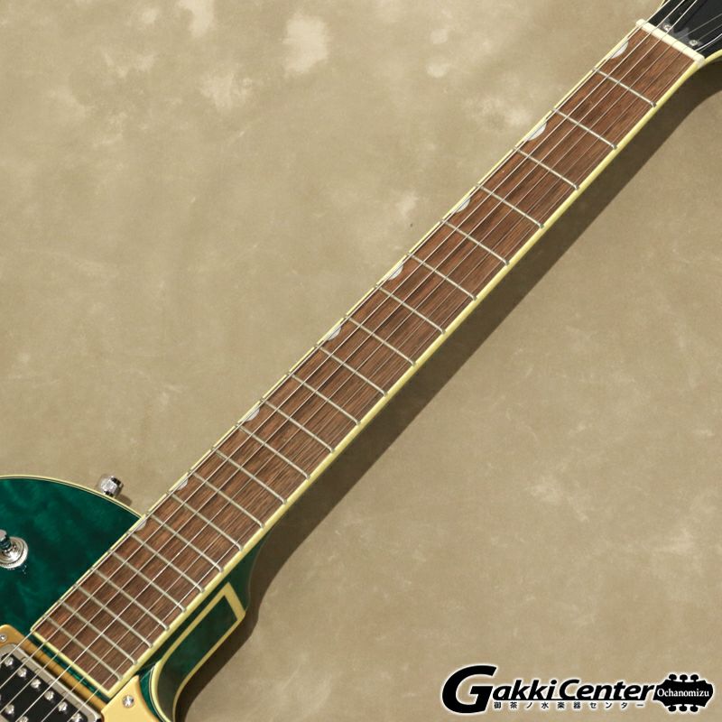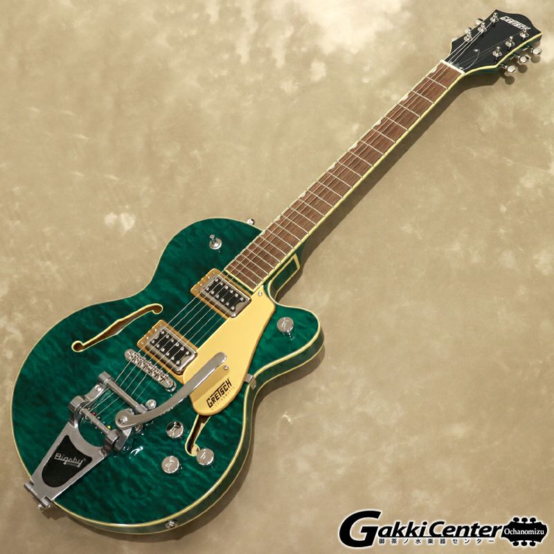 G5655TQM Electromatic Center Block Jr. Single-Cut with Bigsbyは、美しいキルテッドメイプルトップ、バック、サイドを採用したチェンバードスプルースのセンターブロックを備えた小ぶりなボディが特徴で、ダイナミックなレゾナンス、ハイゲインパワー、軽量な快適性を実現しています。