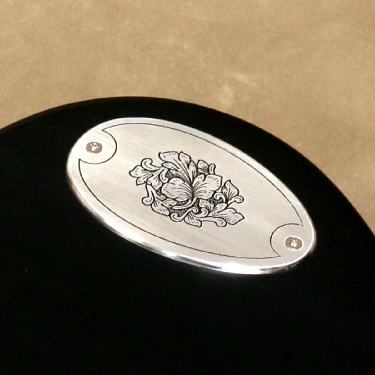 同様にアルミ合金を用いたヘッドのダイアモンド・エンブレム、トラスロッド・カバー、テイルピースやコントロール&スイッチ・バック・プレートに至るまで彫金を施しています。