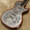 「ヘッドに取り付けているダイアモンド・エンブレムを、メタル・ピックガードのデザインに採り入れてみてはどうか?」という発想が元になり、生まれたデザインです。
