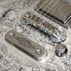 同様にアルミ合金を用いたヘッドのダイアモンド・エンブレム、トラスロッド・カバー、テイルピースやピックアップ・リングをはじめ、アウトプット・ジャック・プレート、コントロール&スイッチ・バック・プレートに至るまで彫金を施しています。