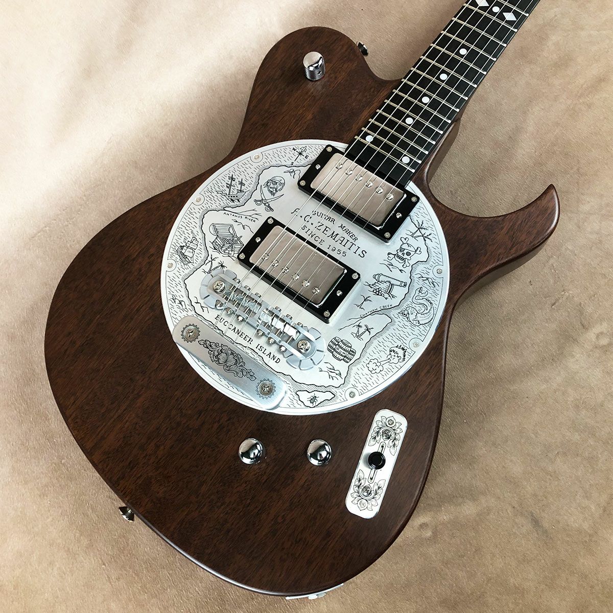 ボディー・トップのアルミ合金のディスク・プレートにマスター・エングレイヴァーのダニー・オブライエン・デザインによるバッカニアー・アイランド(海賊島)と名付けられた彫金が入り、伝統を示す「A. C. ZEMAITIS SINCE 1955」の文字が刻まれたデザインなどクラシックなルックスが特徴です。