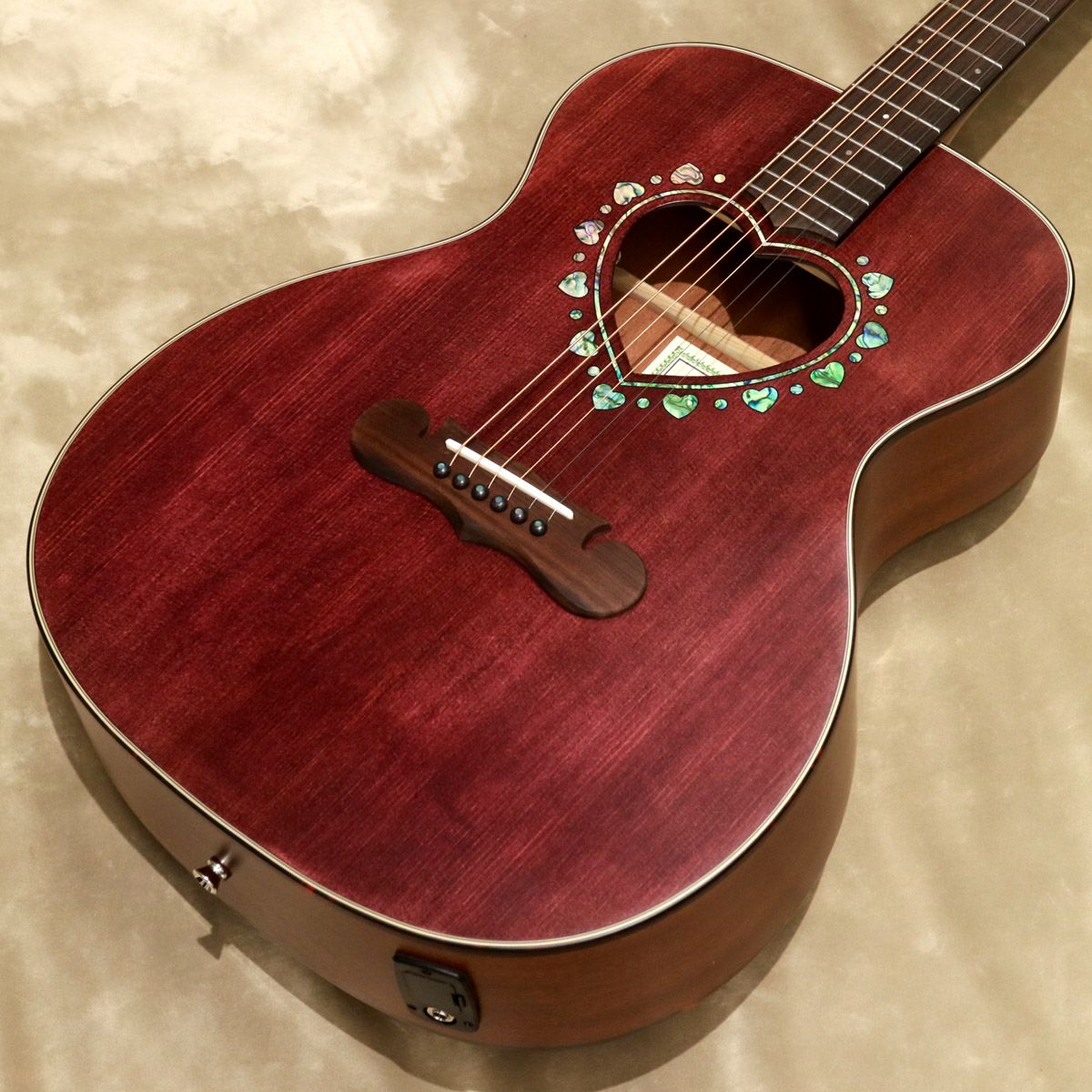●サウンドに広がりを与えるハート形状のサウンドホールと、ハートとドットが交互にちりばめられたアバロン柄のロゼッタ。