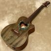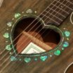 ●サウンドに広がりを与えるハート形状のサウンドホールと、ハートとドットが交互にちりばめられたアバロン柄のロゼッタ。