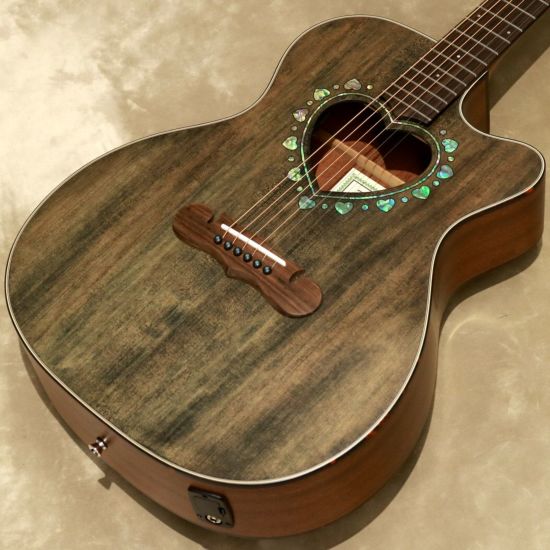●サウンドに広がりを与えるハート形状のサウンドホールと、ハートとドットが交互にちりばめられたアバロン柄のロゼッタ。