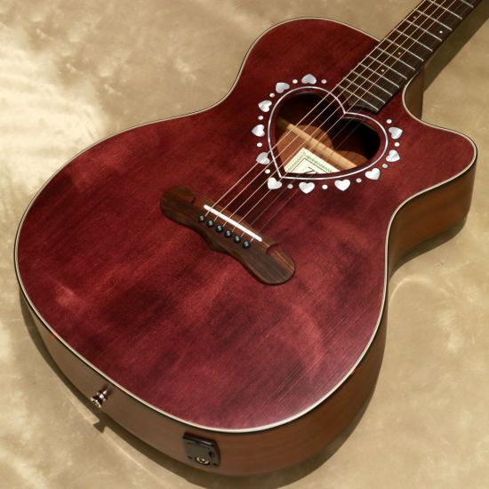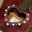 ●サウンドに広がりを与えるハート形状のサウンドホールと、ハートとドットが交互にちりばめられたアバロン柄のロゼッタ。