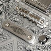 同様にアルミ合金を用いたヘッドのダイアモンド・エンブレム、トラスロッド・カバー、テイルピースやピックアップ・リングをはじめ、アウトプット・ジャック・プレート、コントロール&スイッチ・バック・プレートに至るまで装飾を施しています。