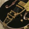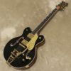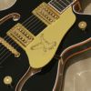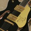 グレッチが提案するセンターブロック構造にファルコン・デザインを導入して生まれたG6636T Players Edition Falcon™ Center Block Double-Cutにブラック・カラーが加わりました。G6636Tは、15.75インチ幅、1.75インチ厚のダブル・カッタウェイ・ボディーのセミ・アコースティック・ギターです。メイプル・ボディーにスプルース・センターブロックを採用し、優れた響きと軽量化を実現するためにブロックの後方をチャンバー加工しています。ヘッドストック・フェイスにはゴールド・スパークルのヴァーティカル・ロゴが入り、メイプル・ネックにはサムネイル・ポジションマーカーがインレイされたエボニー・フィンガーボードを組合せています。ピックアップは、ハイ・センシティヴ・フィルタートロンをマウントし、ウッド・マテリアルのブリッジ・ベースを介さず、アジャストマティック・ブリッジをボディーにダイレクト・マウントしており、弦交換を容易にしたストリング-スルー・ビグスビーB7GPヴィブラート・テイルピースを搭載しています。内部のパーツもベルデン・ワイアー、CTSポット、スイッチクラフト・ジャックとスイッチなど信頼性の高いものだけを採用しています。