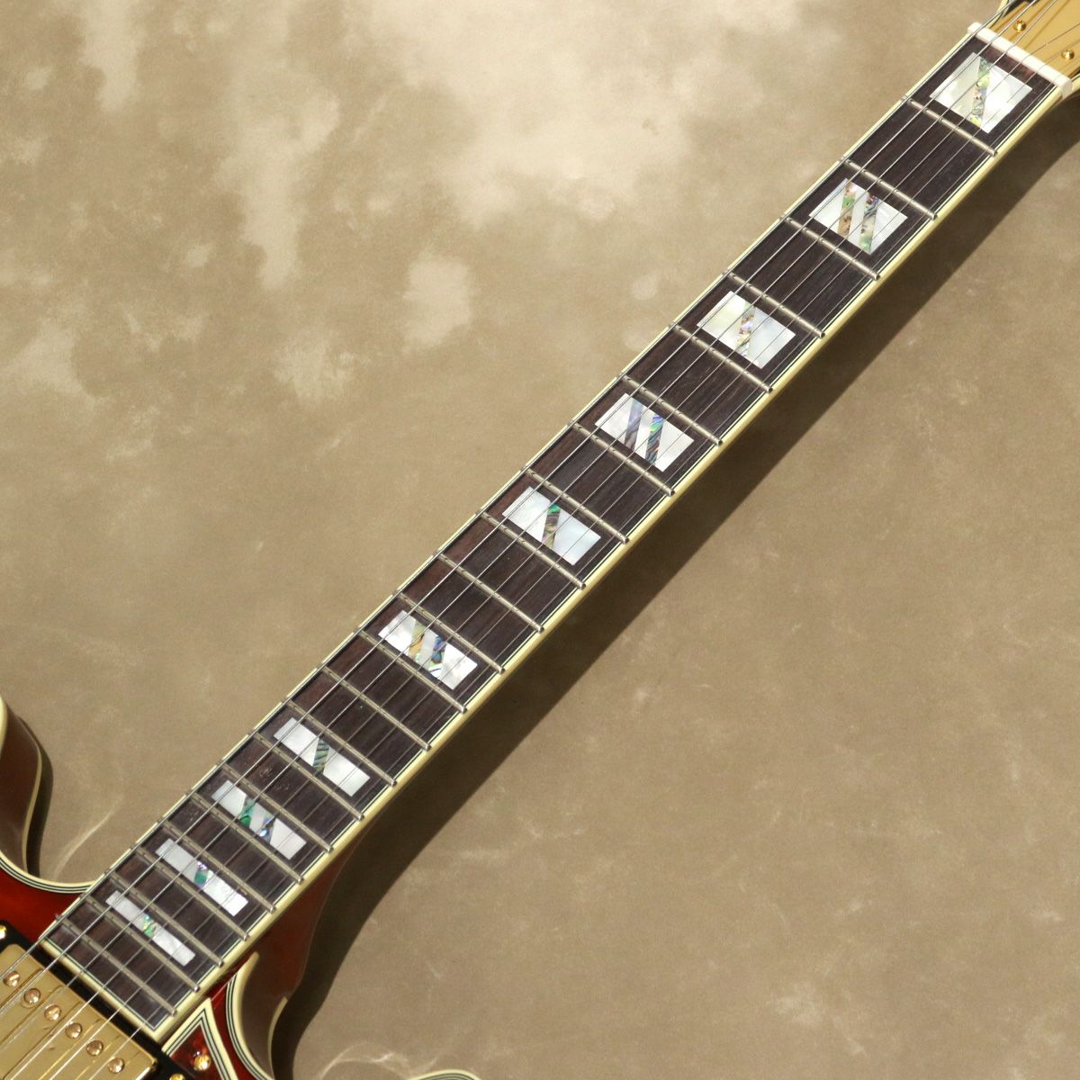 ハードウェアはゴールドで統一し、信頼性の高いグローバーのインペリアル・マシンヘッド、ステアーステップ・トラピーズ・テイルピース&チューンOマティック・ブリッジの仕様です。